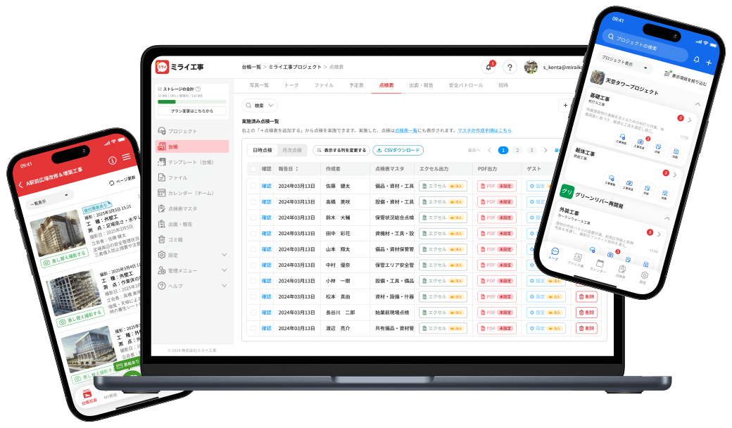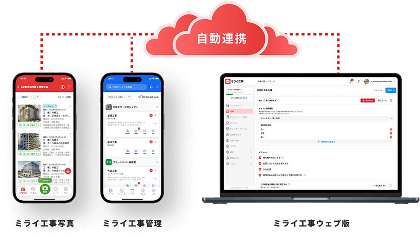 ミライ工事のアプリとWeb版(パソコン版)」のデータは自動で連携されます。プロジェクト情報もそのままに、同じアカウントでご利用いただけます。