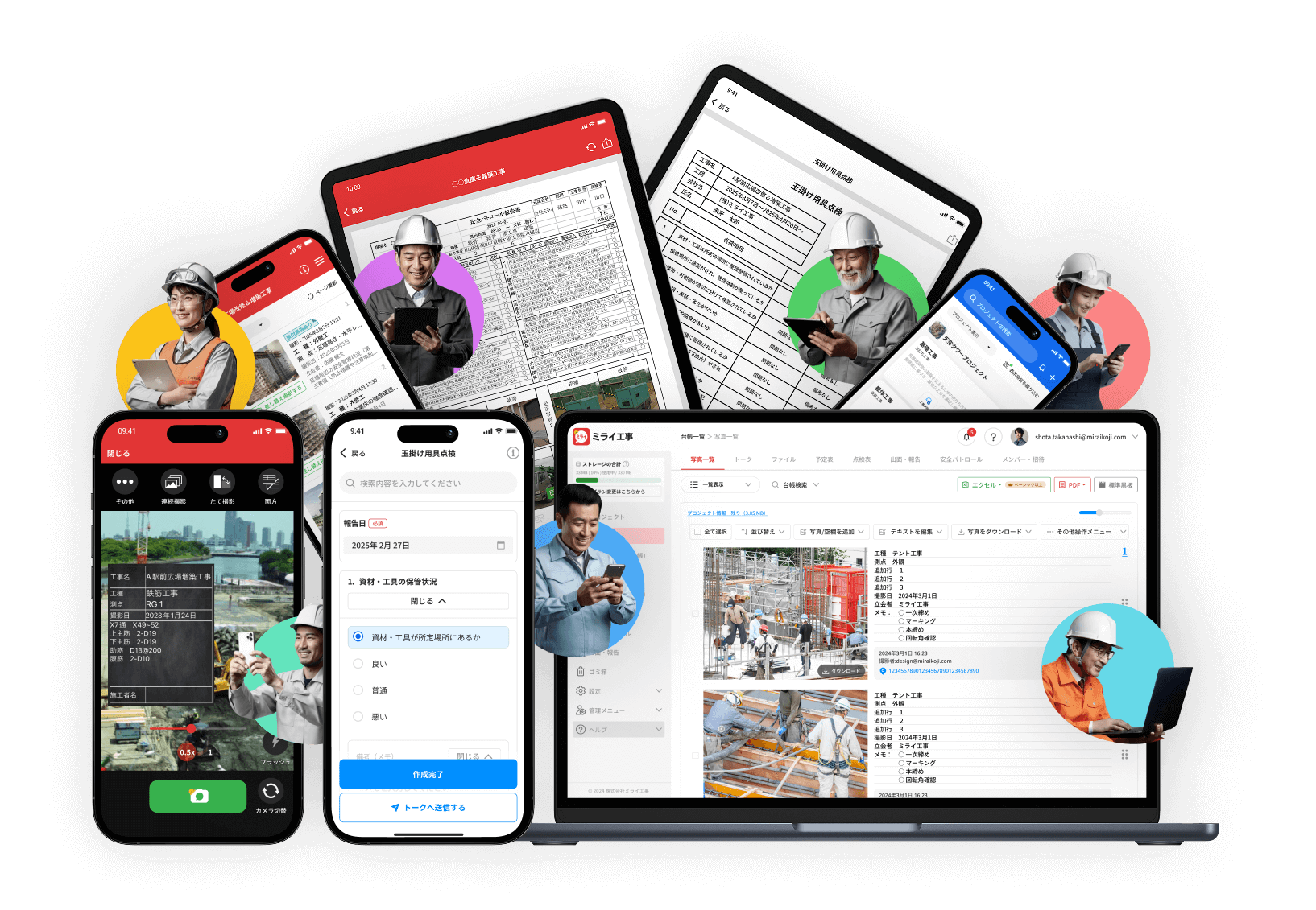 ミライ工事は現場の報告書作成に特化し、連絡・共有・管理まですべて一つで完結します。