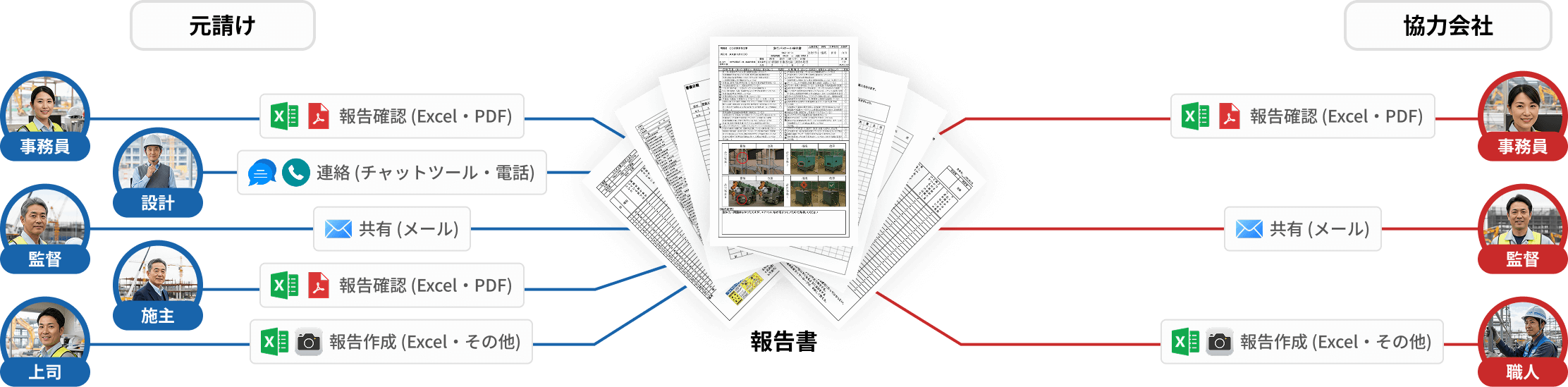 報告書を作る手間依頼元によって書式がバラバラ。Word・Excelなど複数のツールを使い分けて報告書を作成するため、現場担当者の負担が増加している。