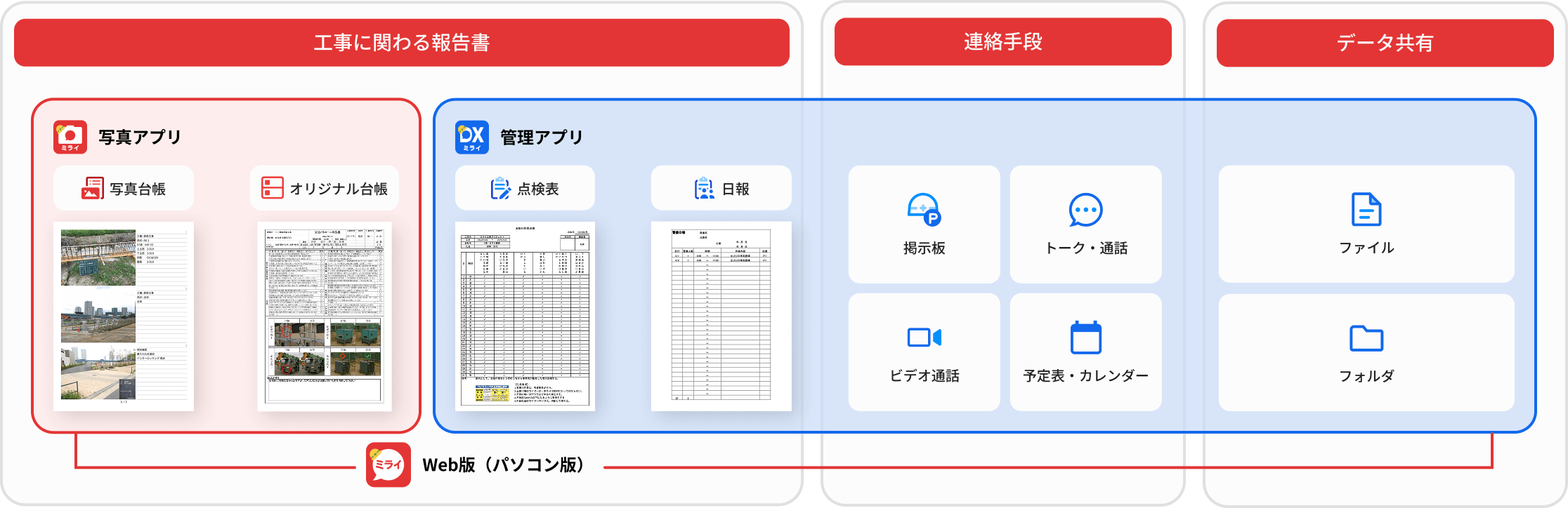 ミライ工事は工事写真や報告書作成だけでなく、連絡・点検・日報・データ管理まで、現場で必要な業務領域を幅広くカバーしています。