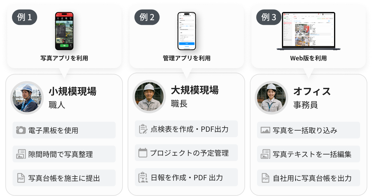 工事写真の撮影と報告書作成に特化したアプリと、点検・日報・連絡・管理機能をまとめたアプリに加え、PC版とBPOサービスまで提供しています。