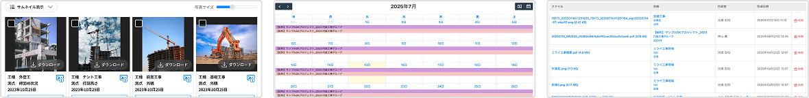 工事写真とも連携するほか、掲示板、トーク、ビデオ通話、ファイル・フォルダなど各種施工管理機能を搭載しています。